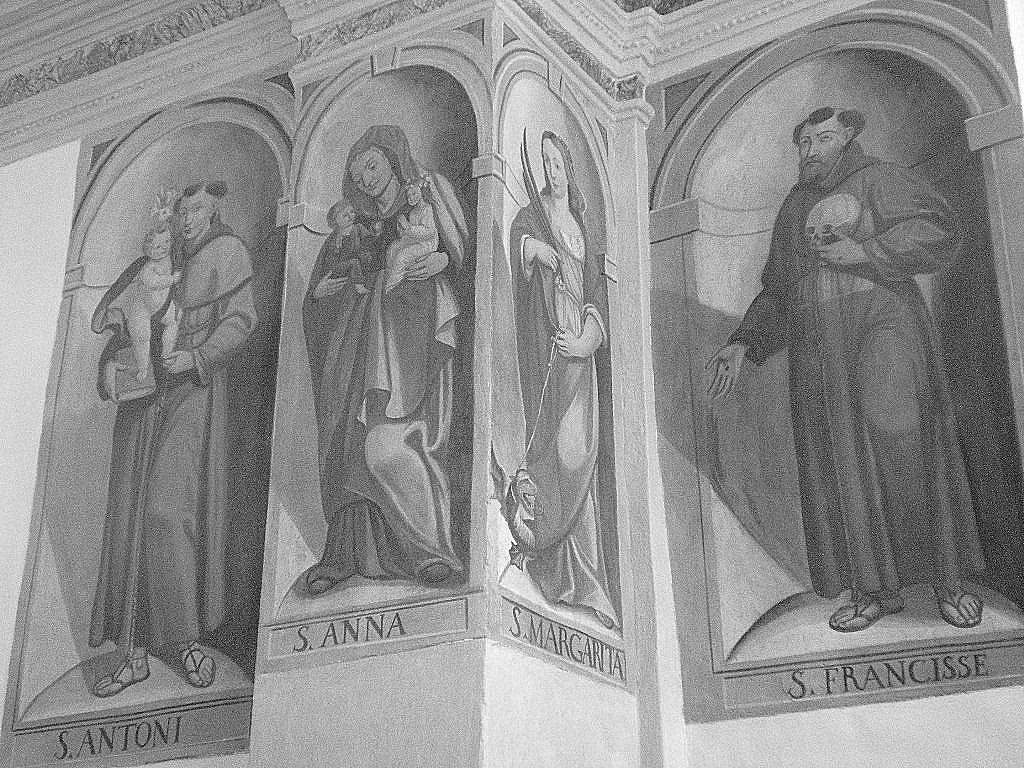 In questa chiesa c’è un dialogo tra i santi, un dialogo che si snoda a due a due: Francesco Saverio e Antonio Abate proteggono la soglia, Lucia e Margherita annunciano la luce, Maria e Francesco d’Assisi offrono ascolto e vicinanza. Nel presbiterio, Sant’Antonio da Padova è accostato a San Carlo Borromeo: il vescovo di Milano è il grande organizzatore che fece fronte alle sfide della Riforma protestante e Antonio da Padova, oltre ad essere il santo delle richieste impossibili e il taumaturgo di uomini e animali, è anche colui che predicò contro le eresie degli Albigesi.